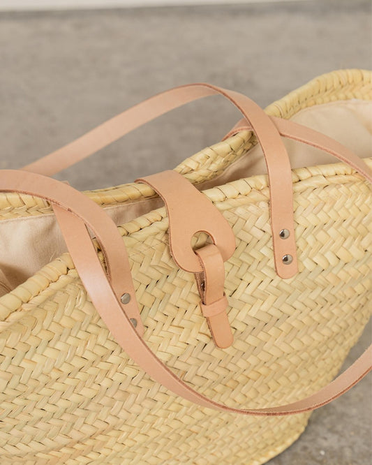 Capazo con solapa de cuero y asas bandolera beige, cierre tela