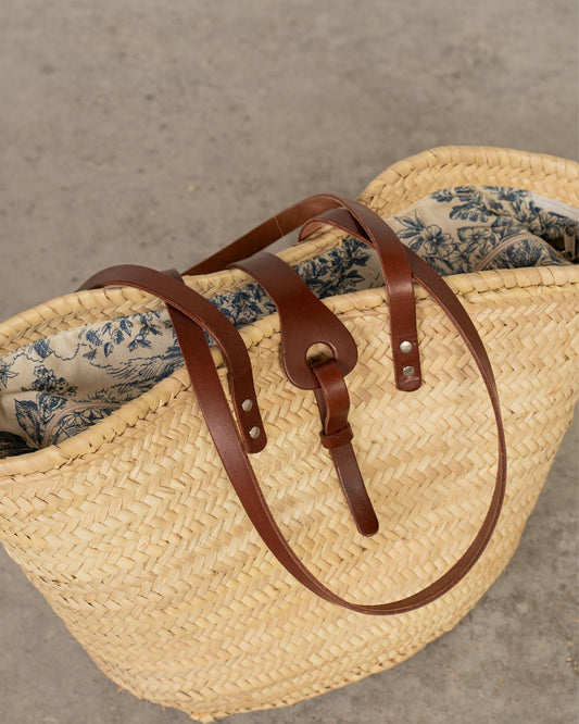 Capazo con solapa de cuero y asas bandolera marrón, cierre tela (45x25x27)
