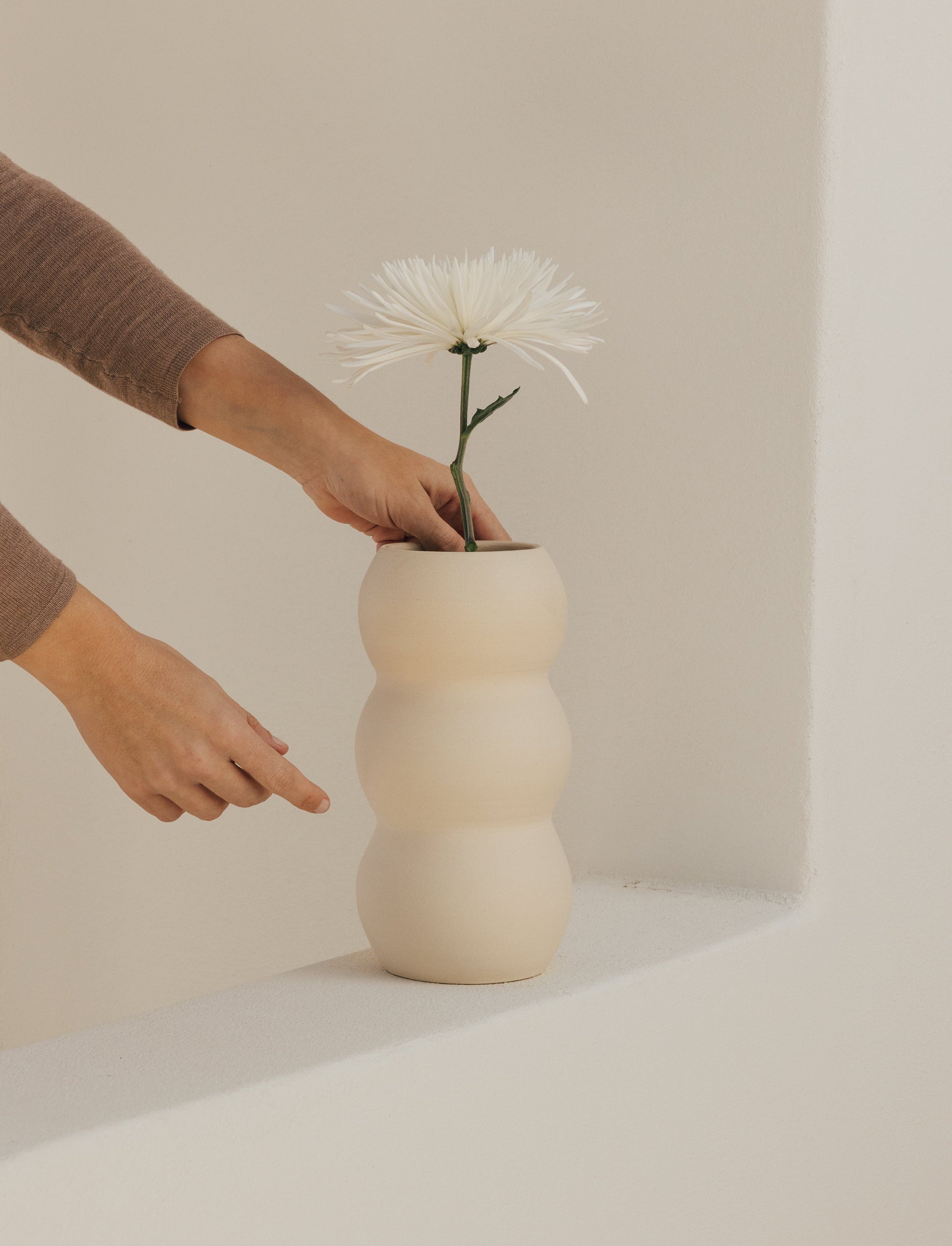 Hecho en España. Jarrón ideal para decoración y flores frescas. Presenta un color blanco con textura áspera. La pieza está impermeabilizada. La monocromía induce al relax, la meditación y la fantasía. El blanco define las piezas de esta colección: ofrece una liberación y conexión con la esencia de la existencia, alejando la distracción de lo trivial. Desde casas a pie de playa hasta hogares de estética rústica en lugares