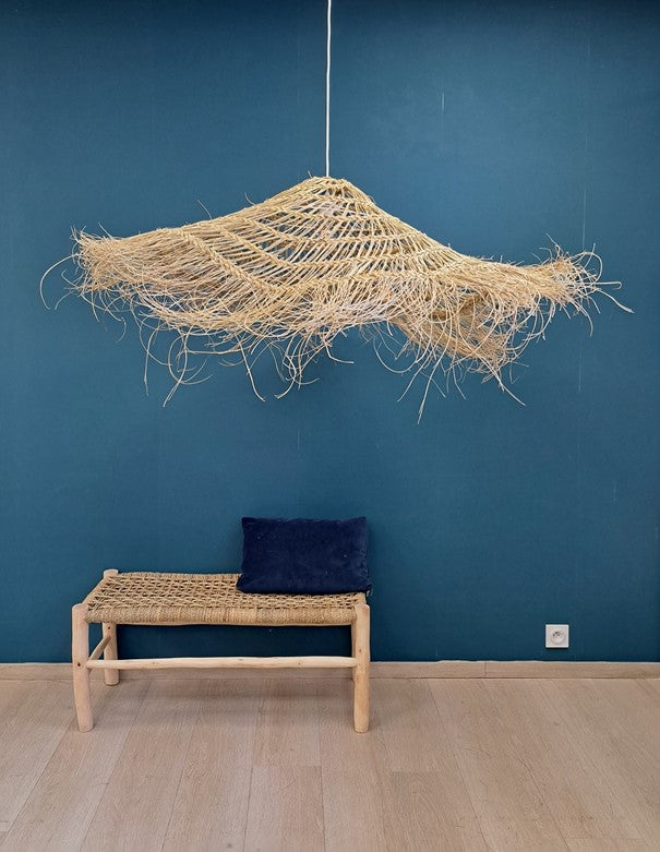 Solina Home. Lámpara de fibra natural, la Caraïbe emana un ambiente cálido y bohemio en su hogar. A primera vista, esta creación artesanal marroquí seduce por su tejido crudo y su forma generosa, de ochenta centímetros de diámetro. Suspendida del techo, se convierte en el punto focal de una habitación, creando una luz suave y natural.