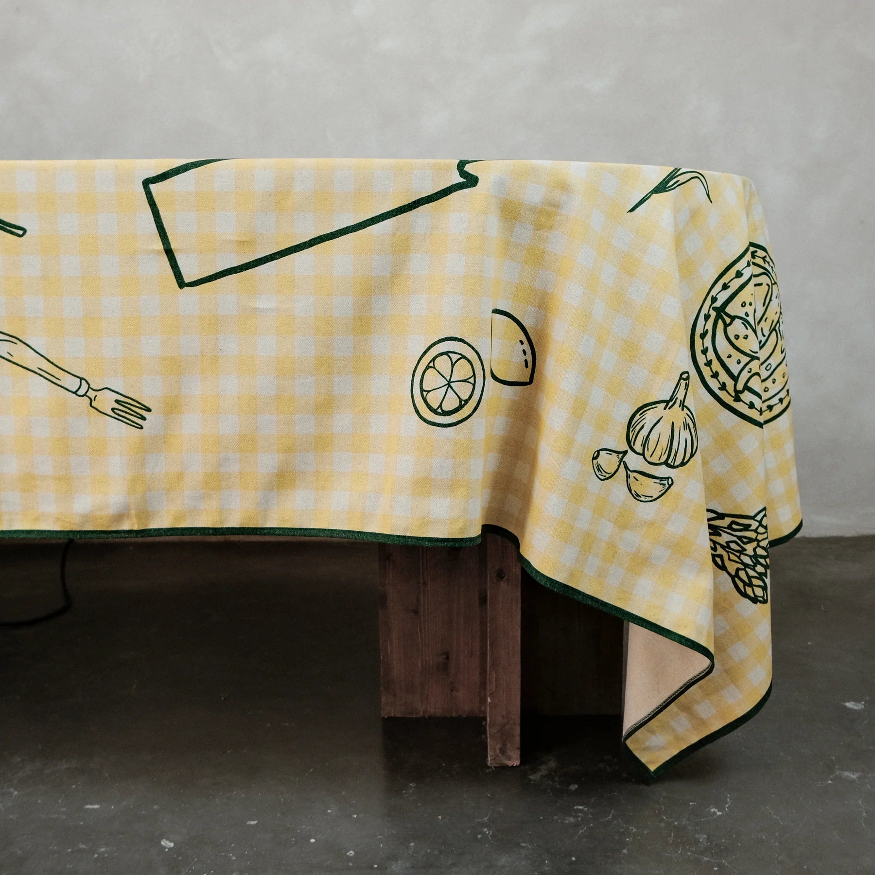 Crema de Clarabasa. Mantel ideal para mesas de hasta 4 comensales. Fabricado en España en mezcla de algodón y lino, con estampado vichy e ilustraciones gastronómicas.