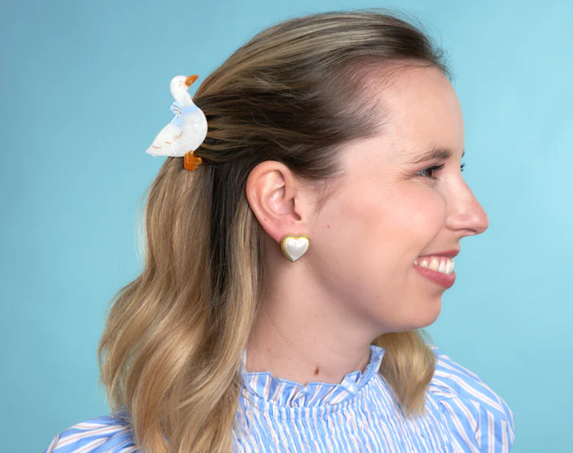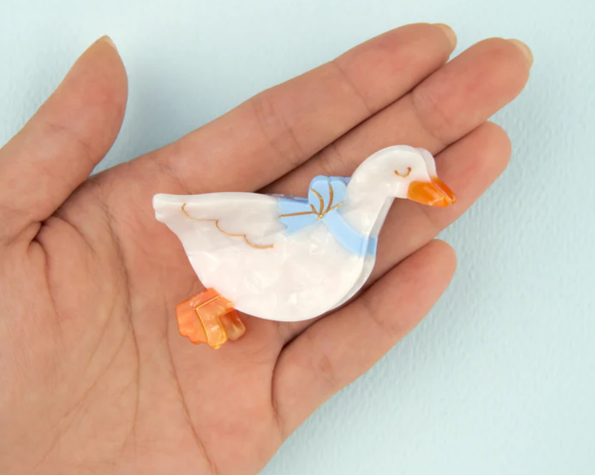 Coucou Suzette. Un lindo ganso en la búsqueda de un nido acogedor. Con sus plumas perladas y cinta azul cielo, este accesorio nostálgico para el cabello de pájaro es la forma más original de decorar todos sus bollos y updos.