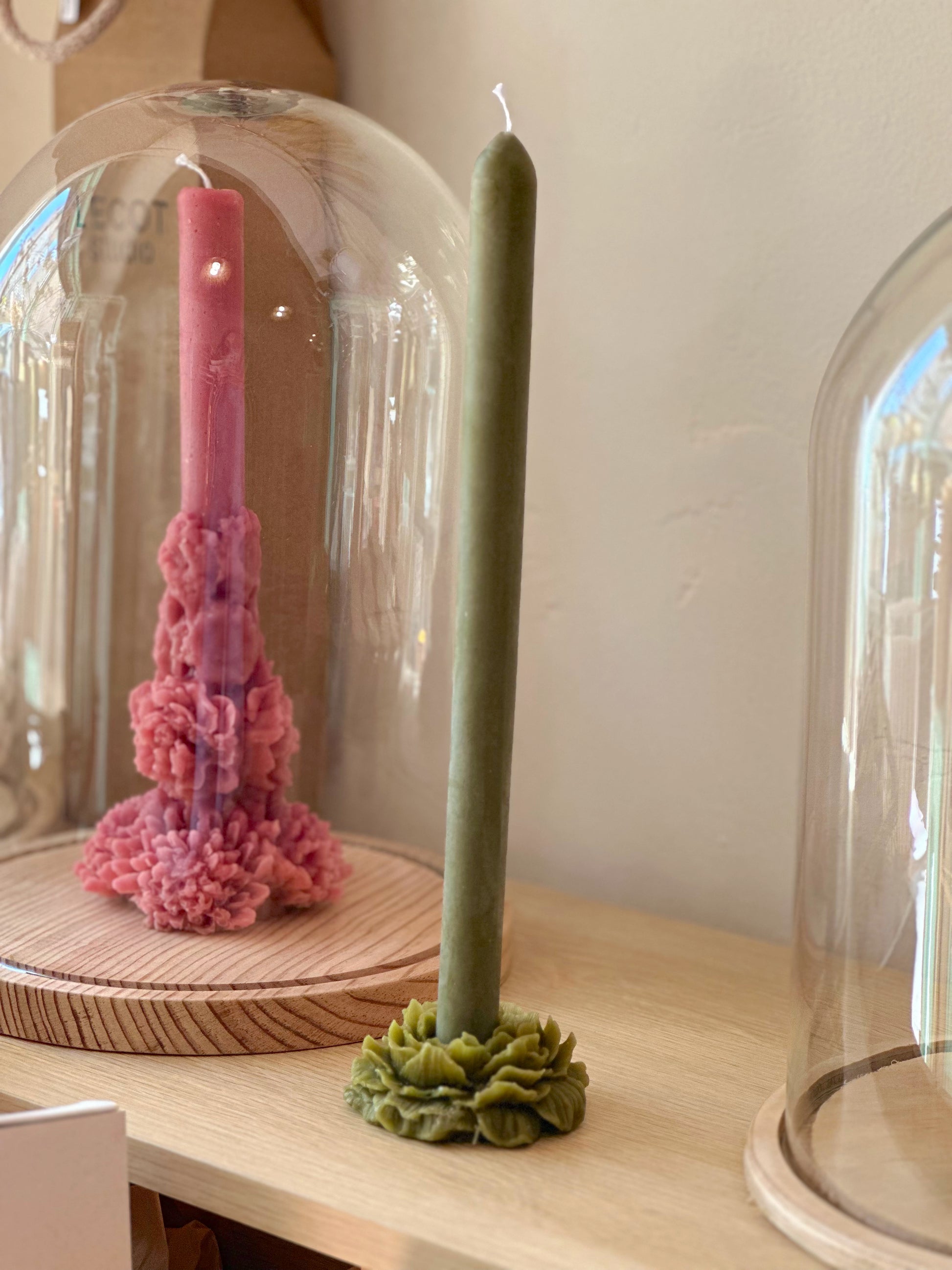 LECOT Studio. Velas con pie en forma de peonía de pura cera de abeja, fabricadas de manera puramente artesanal desde el vertido de la cera hasta la mezcla de pigmentos naturales, todo el proceso se hace de forma manual. Al irse quemando, el olor a la miel hace que no necesiten fragancias artificiales.