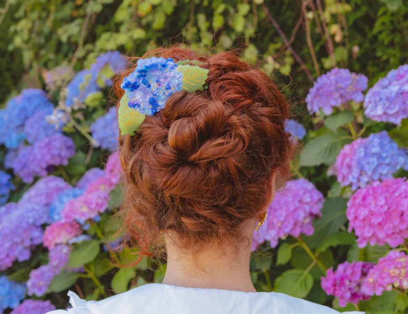Coucou Suzette. Una verdadera joya floral, con pétalos texturizados en suaves tonos azules y lilas que capturan la delicada belleza de las verdaderas hortensias. Perfecto para crear los peinados más románticos y elegantes.