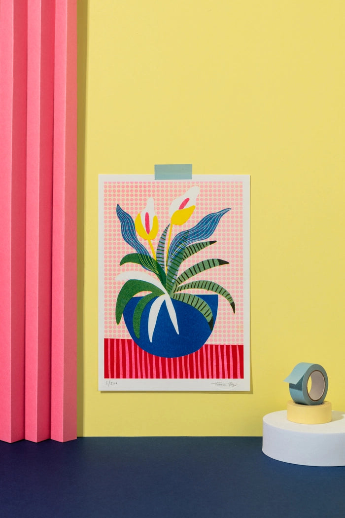 Teresa Rego. Flores de calicanto que florecen en un jarrón azul, bailando sobre un fondo con motivos rosas y rojos.