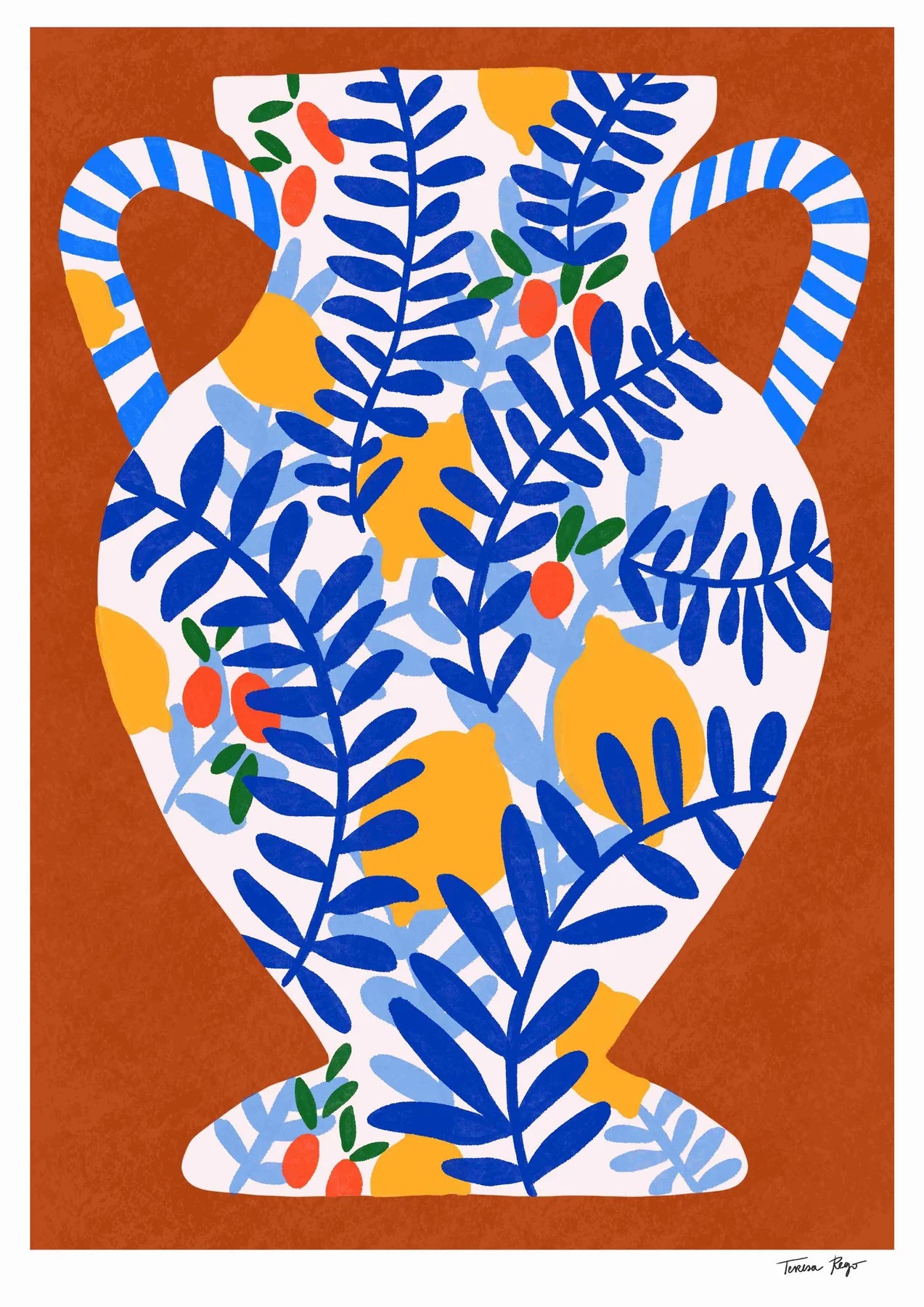 En ese insinuado jarrón combinan los tonos rojos de la tierra con los cítricos, creando una cálida ilustración.